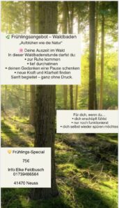 Besondere Schwerpunkte meiner Arbeit sind Körperprozesse wie z.B. eine MST Session (mental screenshot technique) mit der wir schnell und effektiv Blockaden in der Tiefe lösen können. Energiearbeit und Waldbaden.